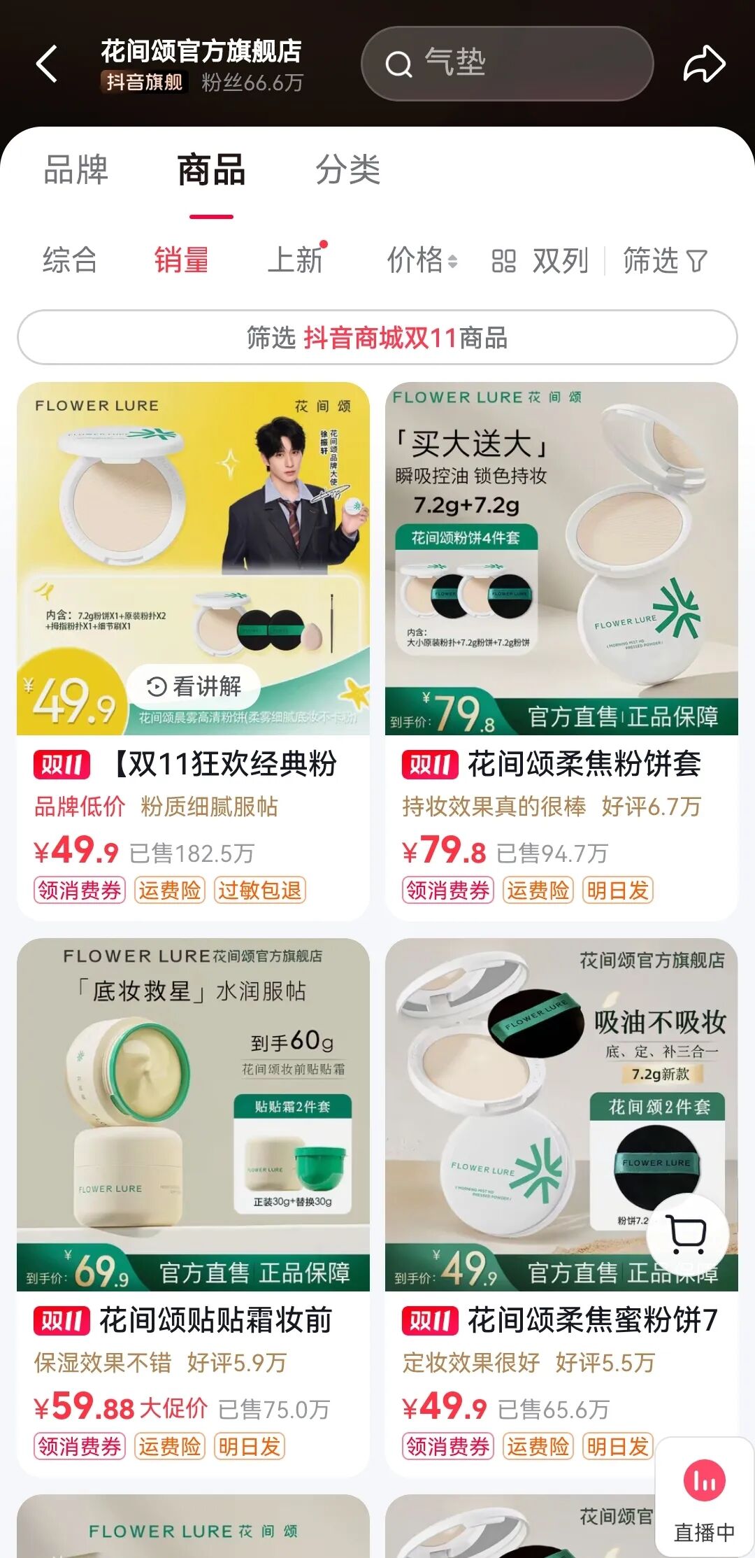 3、抖音粉饼市占率超18%,花间颂首次冲进抖音彩妆季度榜前10