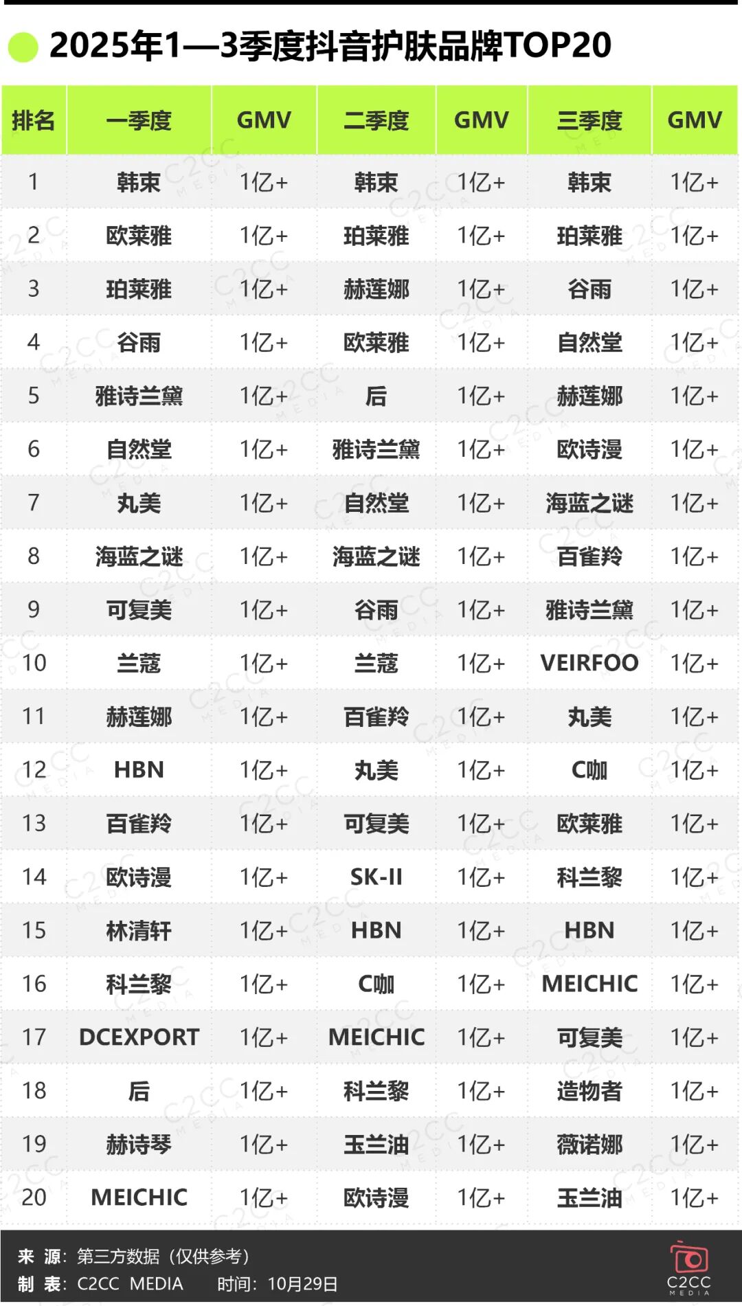 1、韩束蝉联榜首,欧诗漫、百雀羚首次冲进TOP10