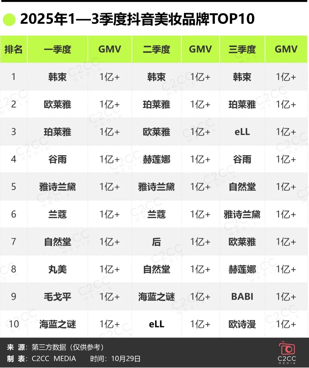 但头部阵营排名流动性增强。欧莱雅从年初的第2名滑落至第7名,海蓝之谜直接跌出前10;自然堂、谷雨等本土品牌则快速崛起,跻身TOP5行列。