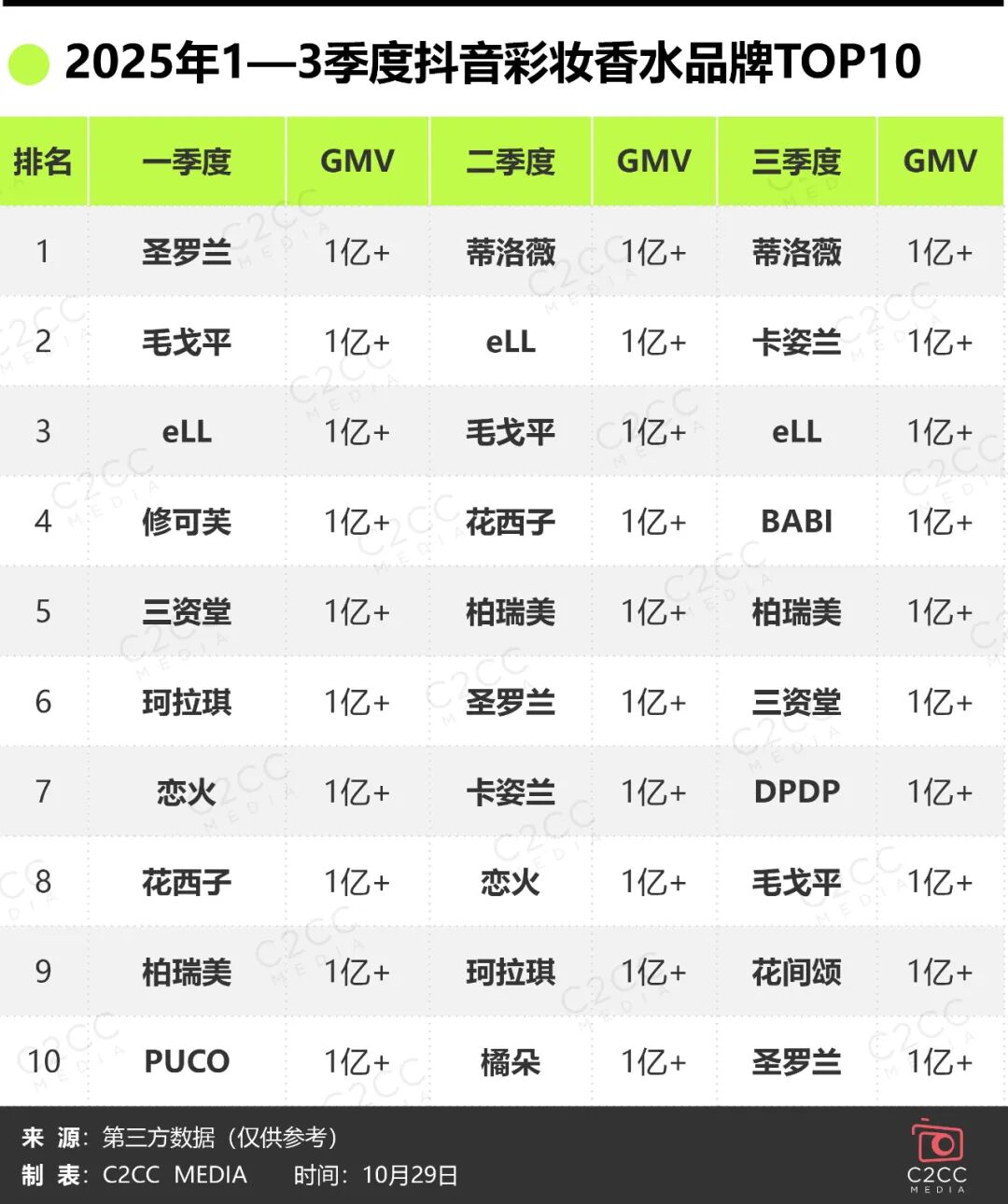 今年Q2、Q3两个季度,蒂洛薇超越圣罗兰拿下抖音彩妆香水TOP1。