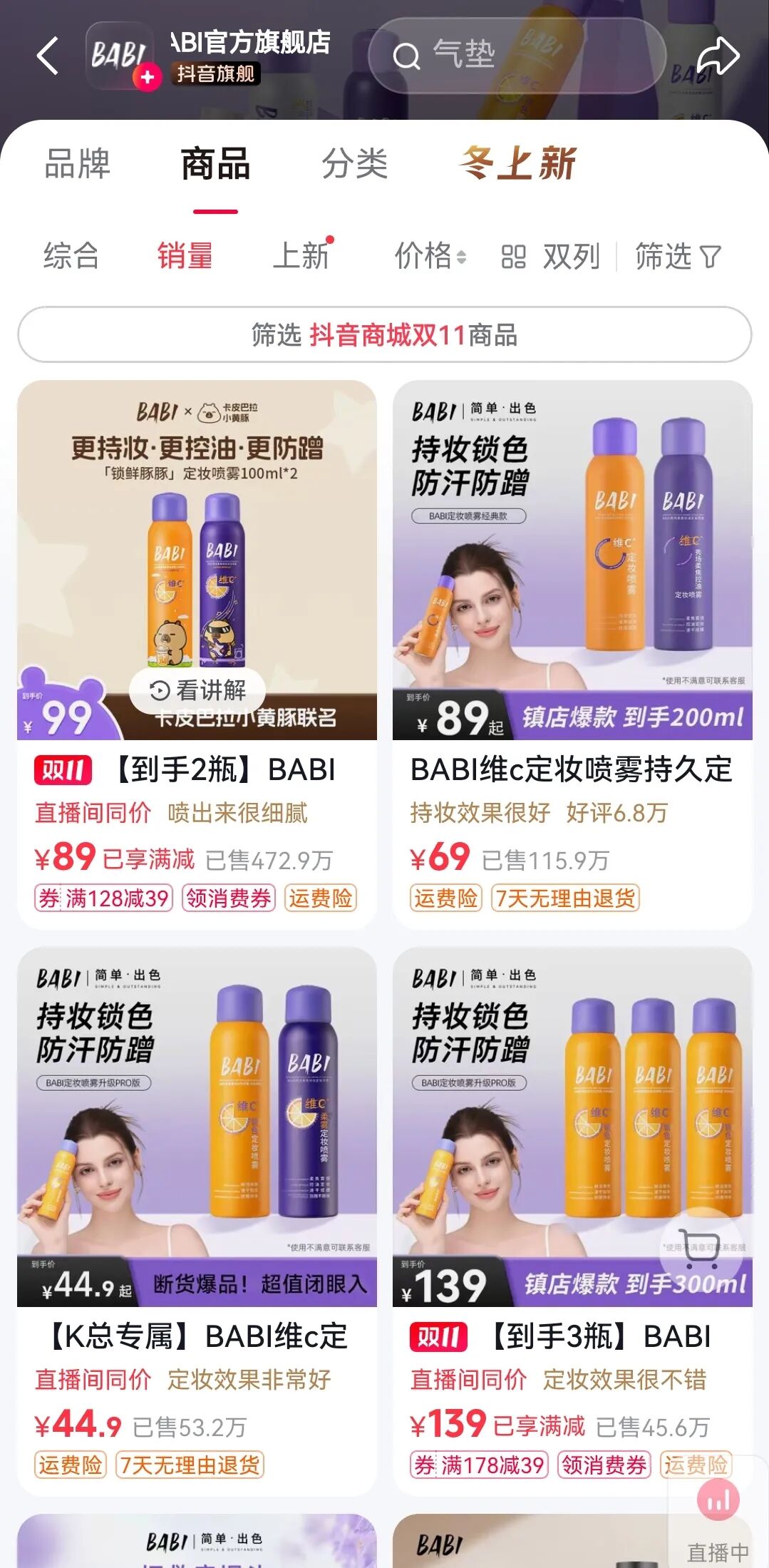 4、BABI凭借定妆喷雾上位,前3季度GMV破7亿