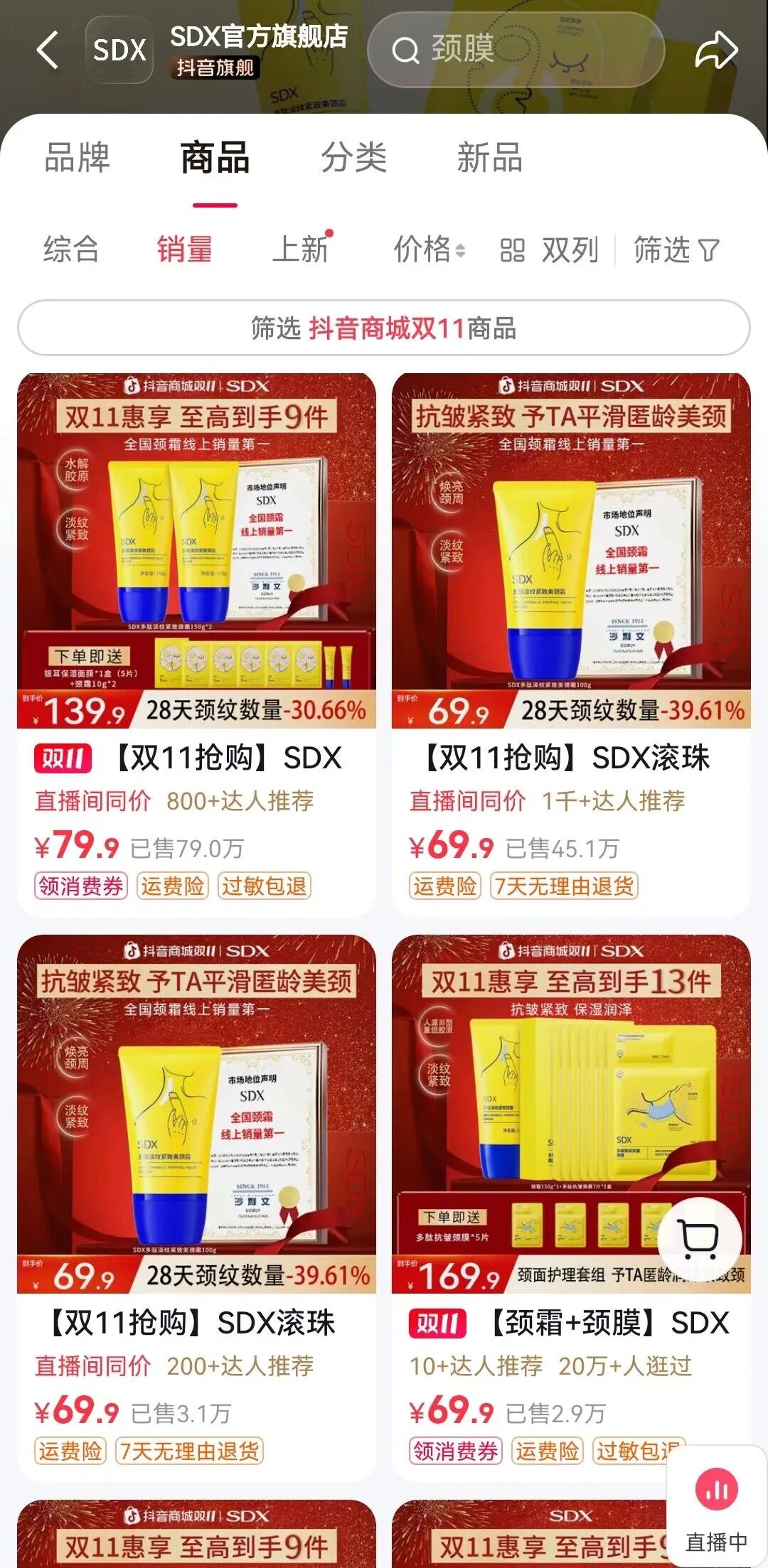 在前3个季度稳居抖音颈部护理TOP3的品牌SDX也值得关注。其以“科学分区护理” 为核心理念,从一款滚珠小金管颈霜单品成功突破。今年以来,该爆品撑起了品牌90%以上的销量。