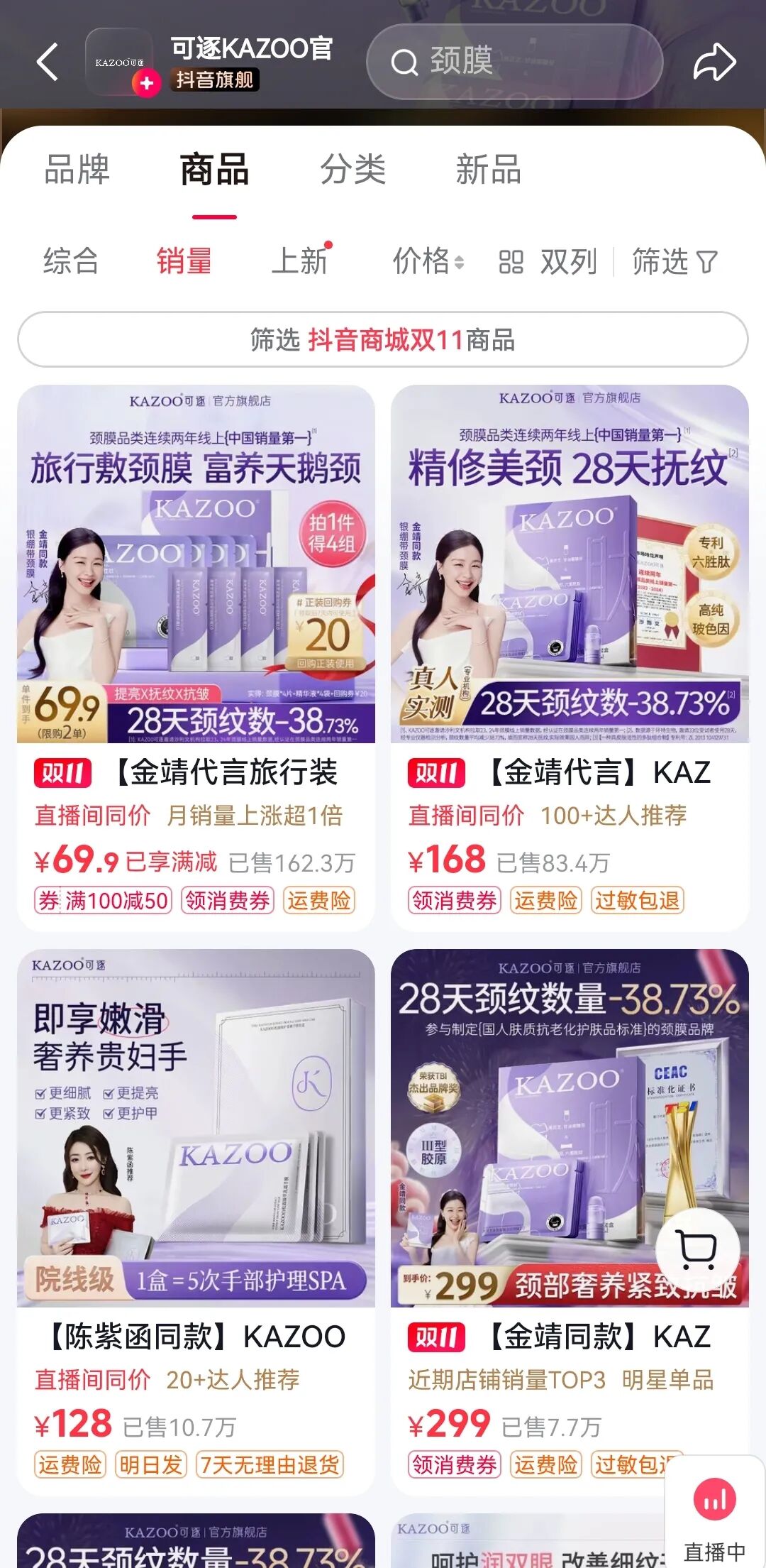 另外从抖音可逐KAZOO官方旗舰店热销产品来看,【金靖代言旅行装】KAZOO多肽淡纹颈膜销量第一,已售162.2万;【金靖代言】KAZOO银绷带颈膜销量第二,已售83.4万。