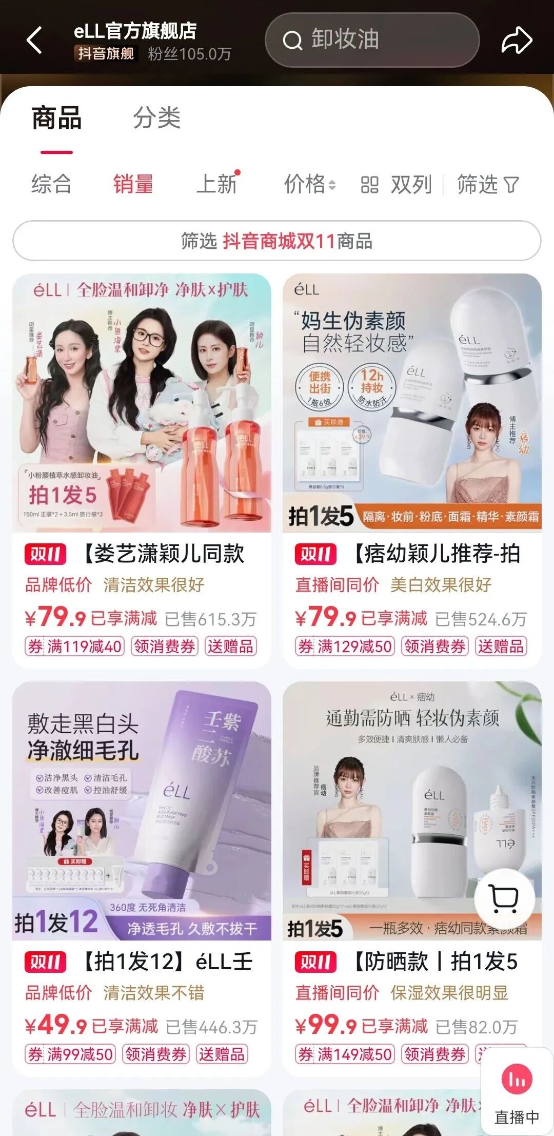 比如,eLL瞄准“懒人化妆”的痛点,打爆了单品“素颜霜”发家,后来又推出了“壬二酸清洁泥膜”。蝉妈妈数据显示,7月份这2款单品就卖出了1亿+。凭借极致投流打法,eLL还打造出全网热销2000万+瓶的“养肤级小粉腰卸妆油”。