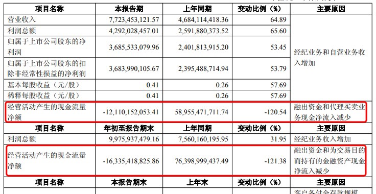 招商证券也因为融出资金和为交易目的而持有的金融资产现金净流入减少,前三季度经营活动产生的现金流量净额为-163.35亿元,同比减少121.38%。其中,第三季度因为“融出资金和代理买卖业务现金净流入减少”,经营活动产生的现金流量净额为-121.10亿元,同比减少120.54%。