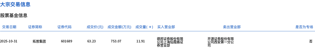 10月31日,拓普集团大宗交易成交11.91万股,成交额753.07万元,占当日总成交额的0.12%,成交价63.23元,较市场收盘价73.78元折价14.3%。