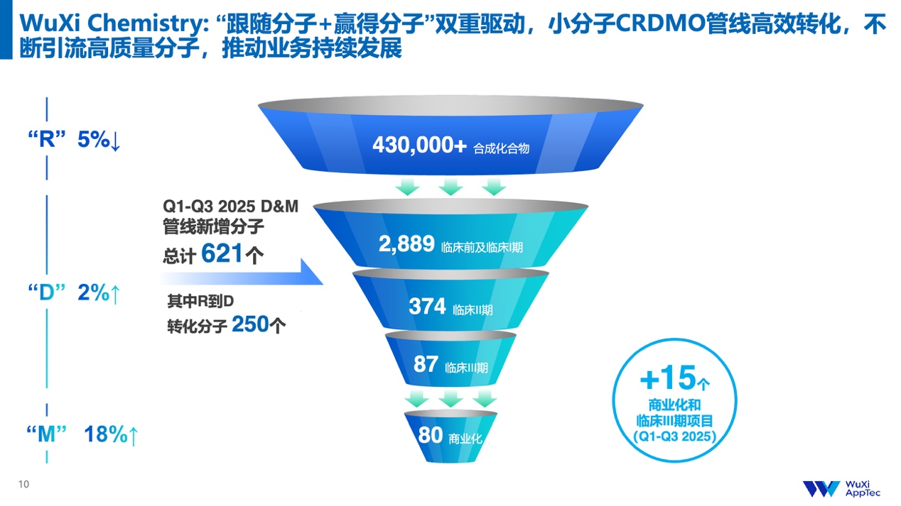 以小分子为例,哪怕现在的药物分子已经越来越复杂,药明康德依旧在12个月里成功在R端合成并交付出超过43万个新化合物,2025年前三季度帮助250个分子完成R到D的转化,截至9月,小分子D&M管线总数达到3,430个,包括80个商业化项目,同比提升了18%。