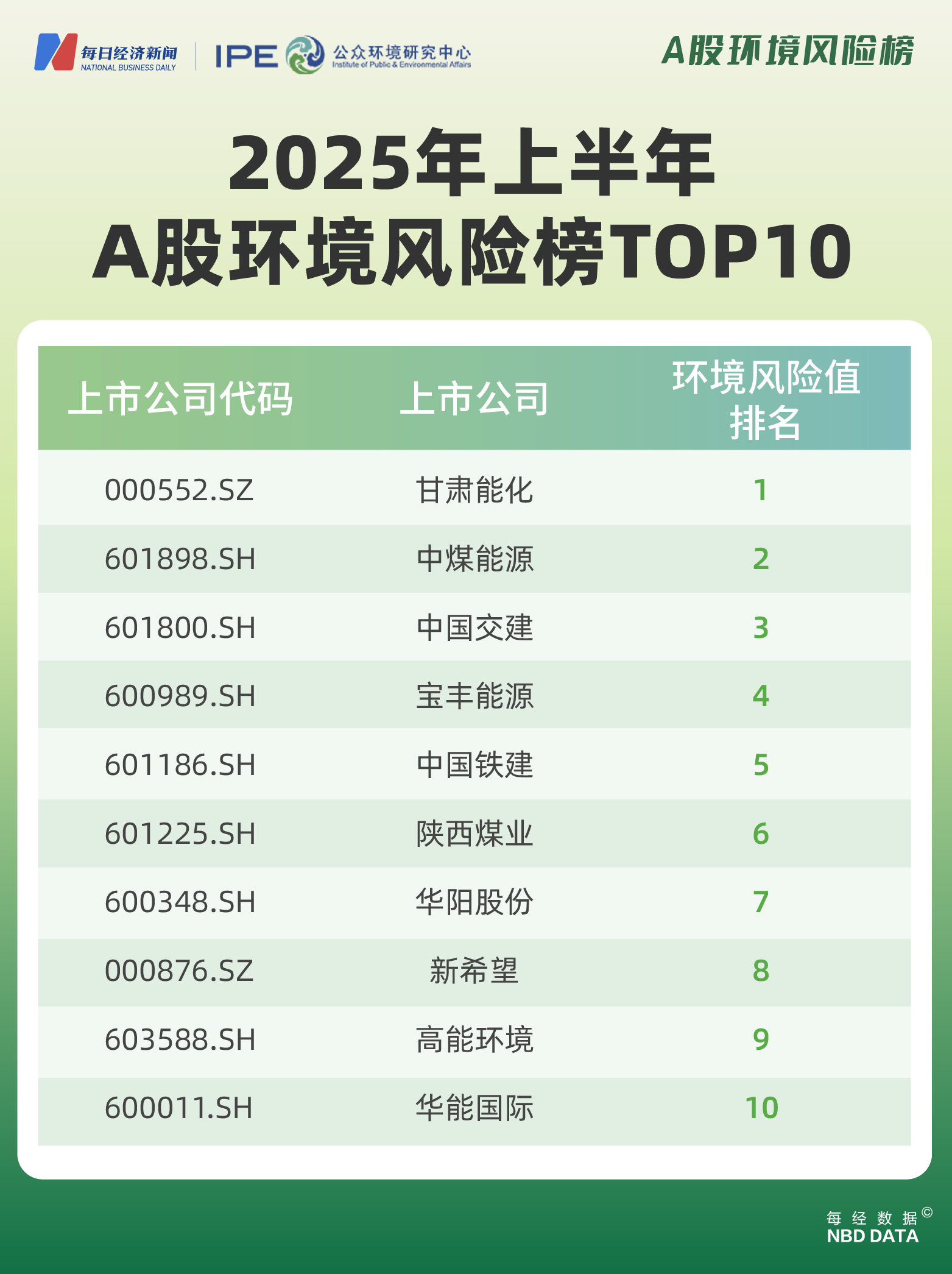 为深度剖析A股上市公司在2025年上半年的环境风险情况,2025年10月30日,每日经济新闻联合环保NGO(非政府组织)公众环境研究中心(蔚蓝地图),筛选监控上市公司及其旗下公司(包括分公司、参股公司和控股公司)的环境表现,依据权威环境监管数据,并加以科学评估模型分析,特别推出2025年上半年A股环境风险榜。