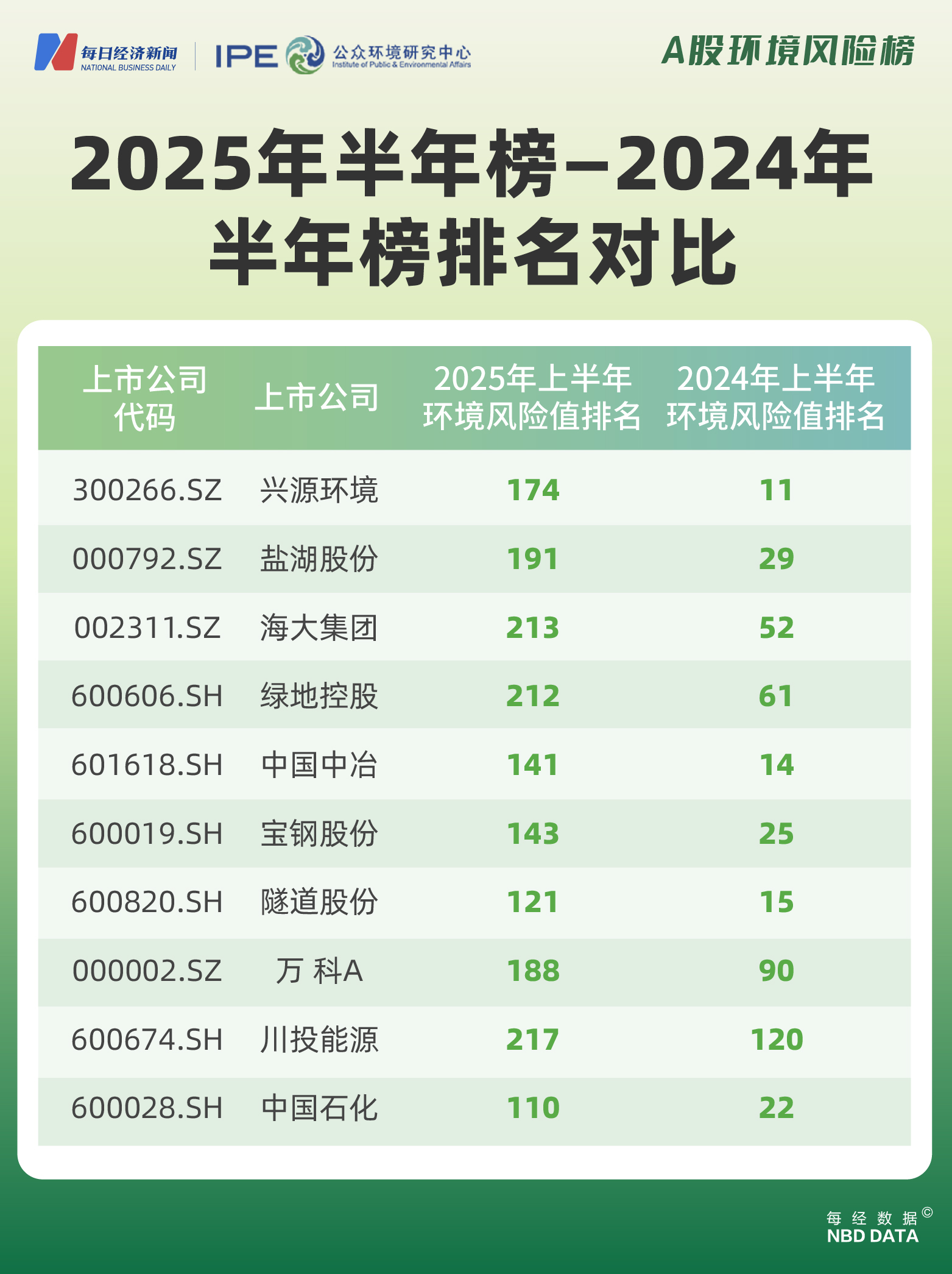 具体来看,与2024年同期相比,兴源环境(SZ300266)、盐湖股份(SZ000792)和海大集团(SZ002311)在2025年上半年A股环境风险榜上的排名均下降160名以上。