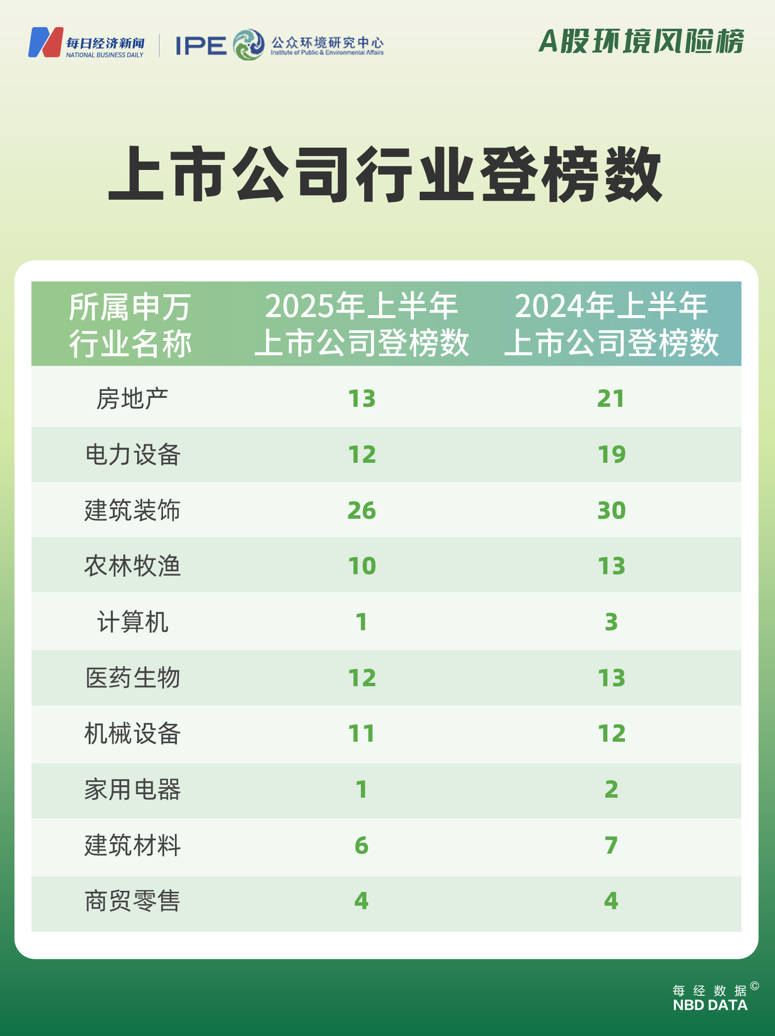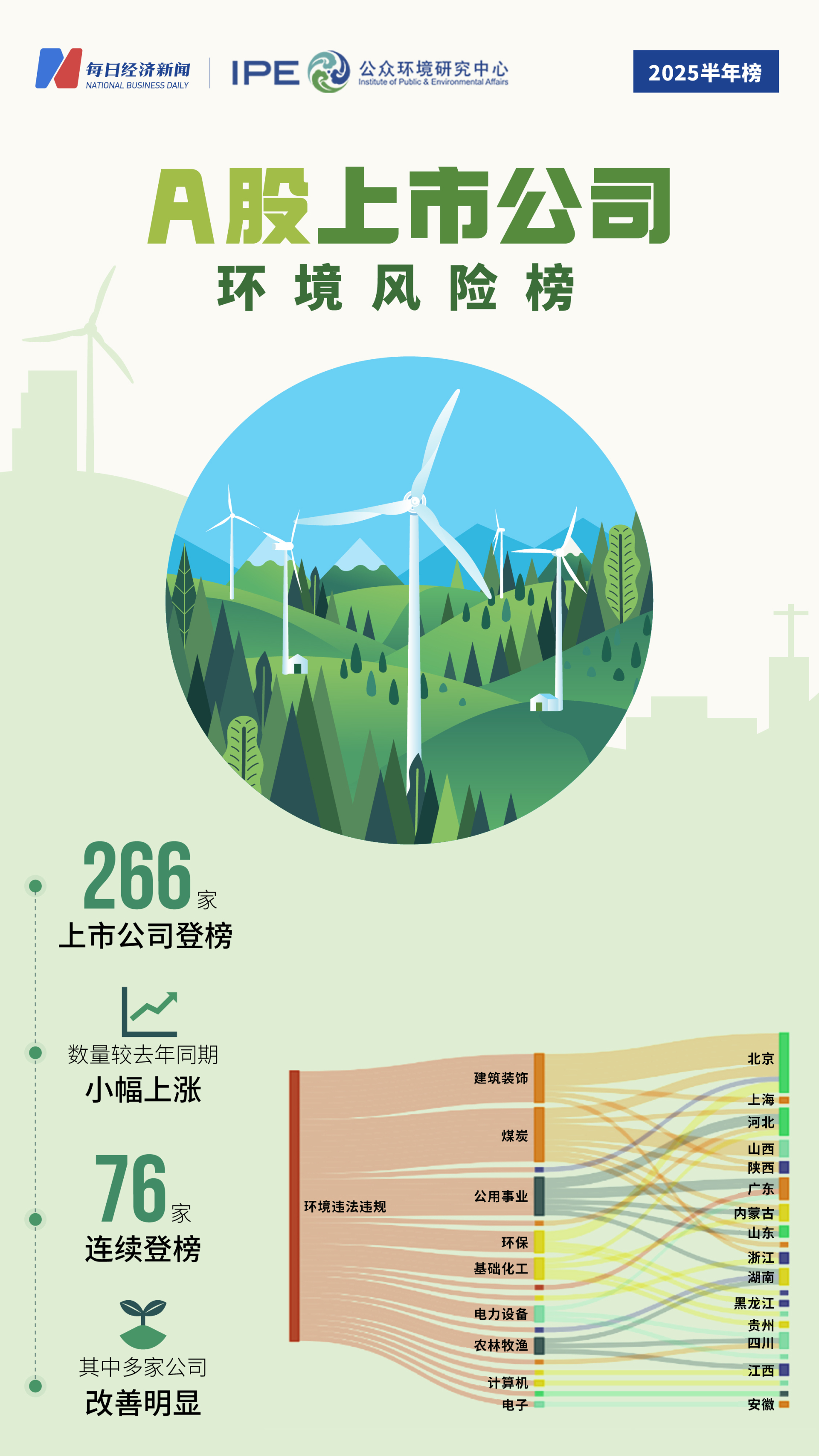 2025年上半年A股环境风险榜数据显示,截至6月30日,共有266家A股上市公司暴露环境风险,比上年同期增加10家。