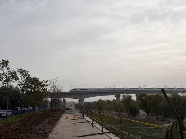 站在永定河左岸堤防堤顶,可以拍到疾驰而过的高铁列车