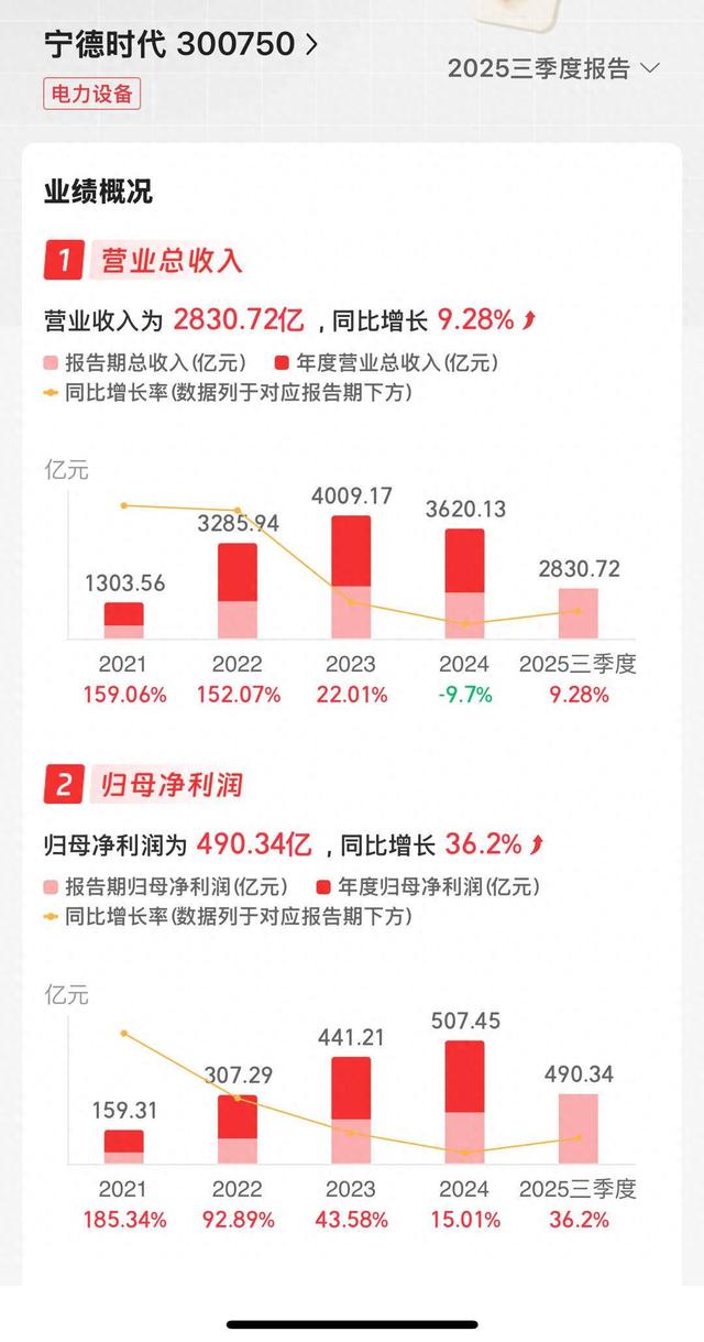 其中,宁德时代遥遥领先。前三季度营收达2831亿元。另9家企业营收在120亿元至450亿元之间,合计尚不及宁德时代。行业利润也呈现突出的龙头效应,宁德时代前三季度归母净利润为490.34亿元,剩余88家公司合计归母净利润为191.60亿元。以此比较,宁德时代是剩余88家公司的2.56倍。