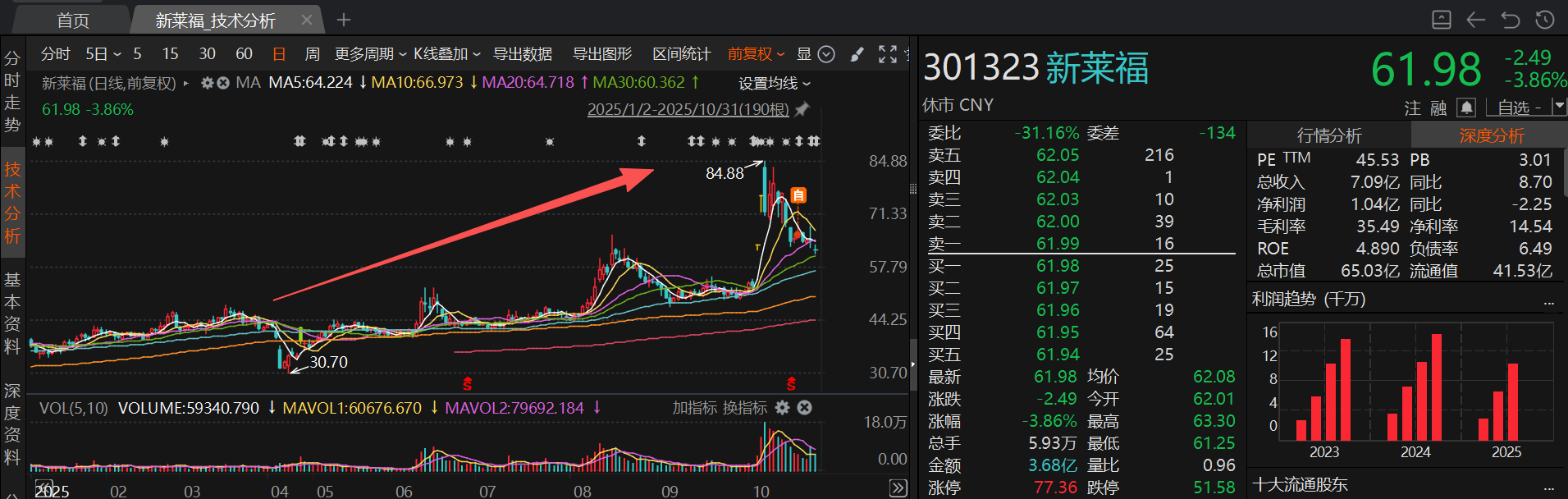 主要产品是吸附功能材料、电子陶瓷材料、其他功能材料的新莱福年内迄今股价累计最大涨幅为176.48%。新莱福10月10日公告,公司拟向圣慈科技、广州易上、华农资产、金诚莱发行股份及支付现金购买其持有金南磁材100%股权。本次交易完成后,金南磁材将成为上市公司子公司。同时,上市公司拟向符合中国证监会规定条件的合计不超过35名(含35名)特定投资者发行股份募集配套资金。交易价格10.54亿元。经交易双方友好协商,本次股票发行价格为33.98元/股,本次交易发行股份的数量为27,916,420股。本次交易预计构成重大资产重组。本次交易完成后,公司将通过整合金南磁材在永磁材料、软磁材料及PM精密合金领域的核心技术优势,实现业务边界的战略性拓展与产业链深度协同。通过整合双方在材料研发、生产工艺及市场渠道的互补性优势,公司将进一步巩固在功能材料领域的行业地位,提升主营业务核心竞争力与市场覆盖能力,并拓展新的增长空间。