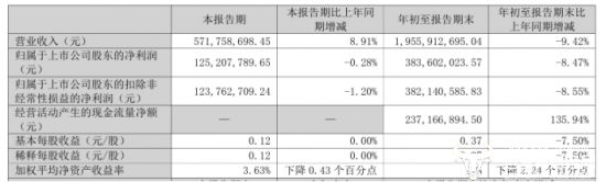 而前三季度营业收入为19.56亿元,同比下降9.42%,归母净利润为3.84亿元,同比下降8.47%。其中第三季度,也就是丁兴贤任职期间,公司营业收入实现同比增长8.91%至5.72亿元,归母净利润为1.25亿元,同比下降0.28%,下降幅度也有所收窄。