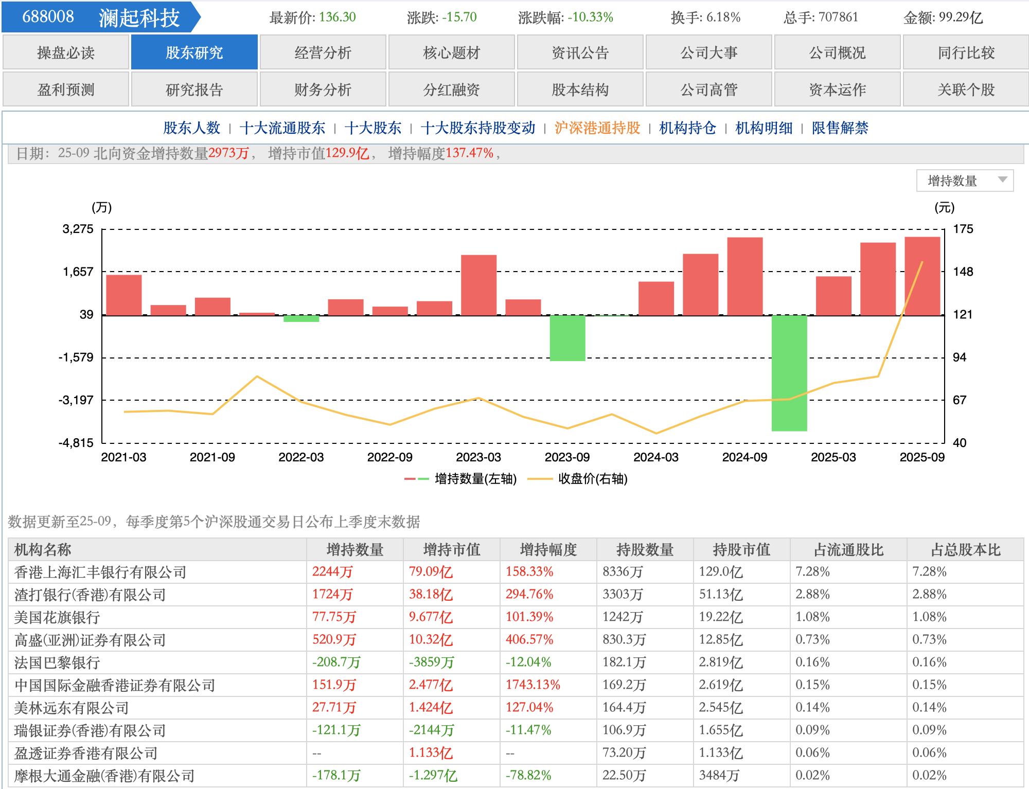 (图:截至第三季度末,海光信息前十大流通股东名单)与前述几家公司不同,澜起科技在第三季度受到了沪深港通北向资金的青睐。2025年前三个单季度,北向资金分别增持澜起科技1478万股、2757万股、2973万股,环比增持幅度分别为86.6%、137.47%,有所加大。