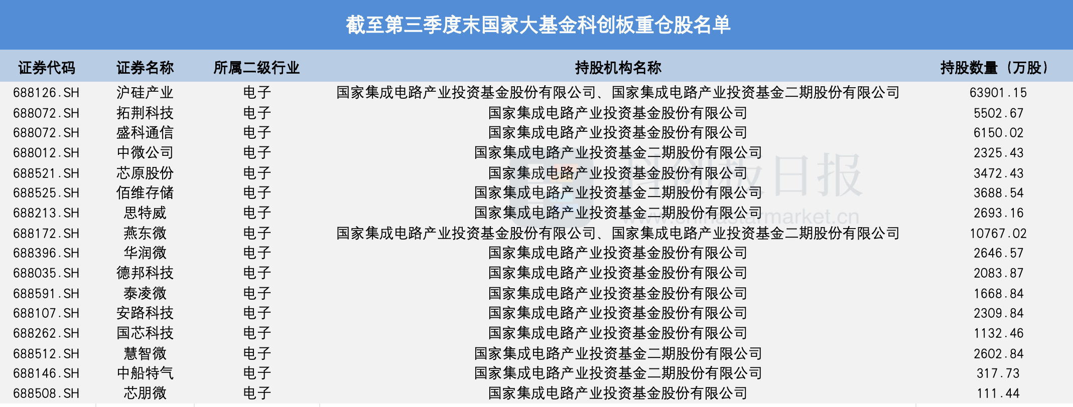 值得一提的是,截至第三季度末,大基金总共重仓了16家科创板公司,这些公司所属二级行业均为电子领域。其中,大基金在第三季度末成为2家科创板公司——沪硅产业、拓荆科技的第一大流通股东。