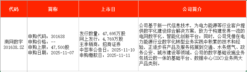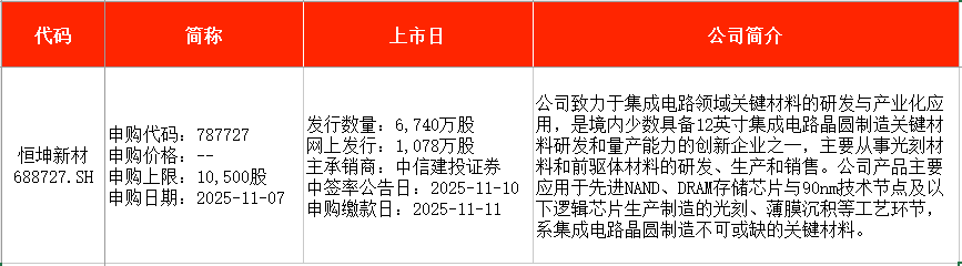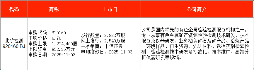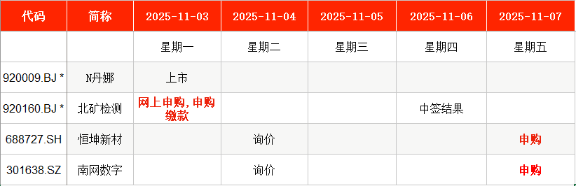 从时间表看,北矿检测(920160)将在本周一(11月3日)申购;恒坤新材(688727)、南网数字(301638)均将在本周五(11月7日)申购。