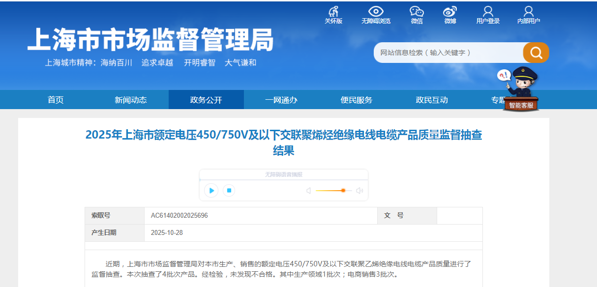 近期,上海市市场监督管理局对本市生产、销售的额定电压450/750V及以下交联聚乙烯绝缘电线电缆产品质量进行了监督抽查。本次抽查了4批次产品。经检验,未发现不合格。其中生产领域1批次;电商销售3批次。