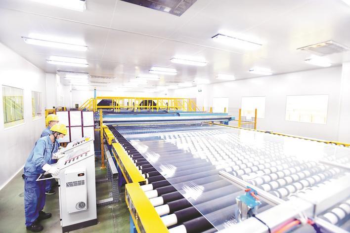 咸宁南玻光电玻璃有限公司车间内,工人们在流水线旁忙碌。