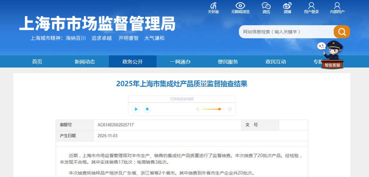 近期,上海市市场监督管理局对本市生产、销售的集成灶产品质量进行了监督抽查。本次抽查了20批次产品。经检验,未发现不合格。其中实体销售17批次;电商销售3批次。