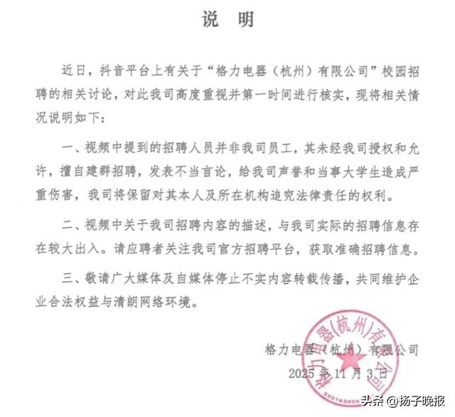 视频截图11月3日晚间,针对格力杭州公司校园招聘相关讨论,格力电器(杭州)有限公司发布情况说明称,视频中提到的招聘人员并非公司员工,其未经公司授权和允许,擅自建群招聘,发表不当言论,给公司声誉和当事大学生造成严重伤害,公司将保留对其本人及所在机构追究法律责任的权利。视频中关于公司招聘内容的描述,与公司实际的招聘信息存在较大出入。