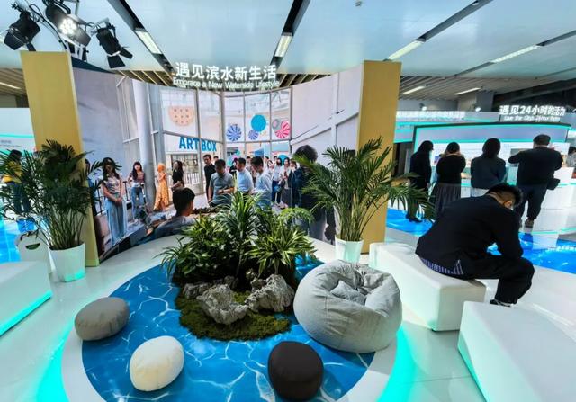 滨水空间是朝阳区的特色之一,弧形LED屏与实景美陈相结合,生动还原了亮马河等水岸经济的独特魅力。