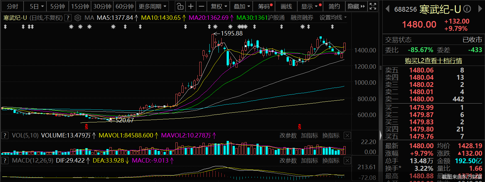 截至目前,陈天石持有寒武纪28.35%的股份。二级市场上,11月6日,寒武纪盘中股价大涨,最终收涨9.79%,报1480元/股,再度超越贵州茅台收盘价,最新总市值约为6240.94亿元。拉长时间线来看,8月1日—11月6日,这64个交易日内,寒武纪区间累计涨幅108.6%,同期大盘涨幅12.16%。