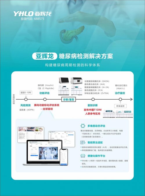 作为国内IVD创新企业代表之一,亚辉龙致力于为糖尿病全病程管理提供完整的检测方案,涵盖风险预测、免疫分型、胰岛功能评估、疗效监测等全病程: