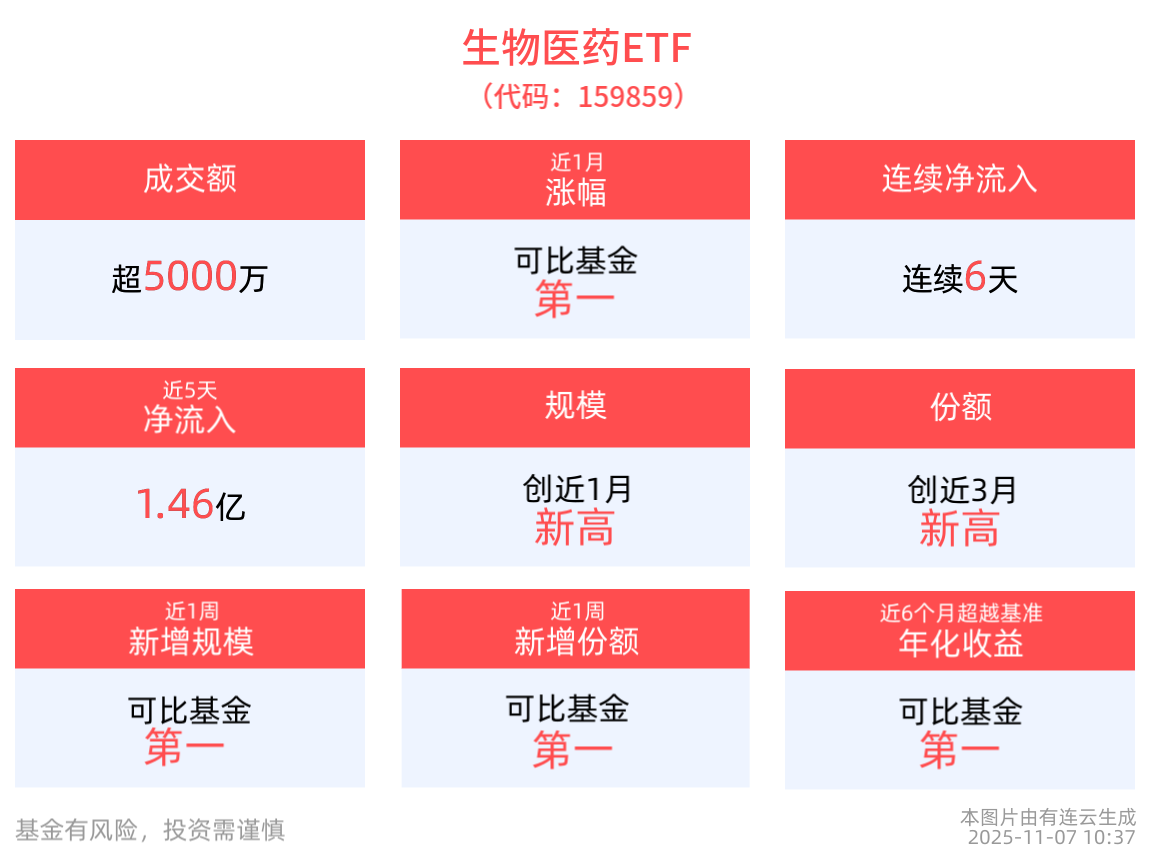 截至11月6日,生物医药ETF(159859)近半年累计上涨20.23%,涨幅排名可比基金第一。生物医药ETF(159859)最新规模达32.66亿元,创近1月新高。生物医药ETF(159859)最新份额达78.59亿份,创近3月新高。