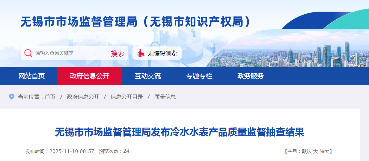 中国质量新闻网讯 据江苏省无锡市市场监督管理局网站消息,2025年度,无锡市市场监督管理局对冷水水表产品质量进行了监督抽查。共抽查产品4批次,未发现不合格。