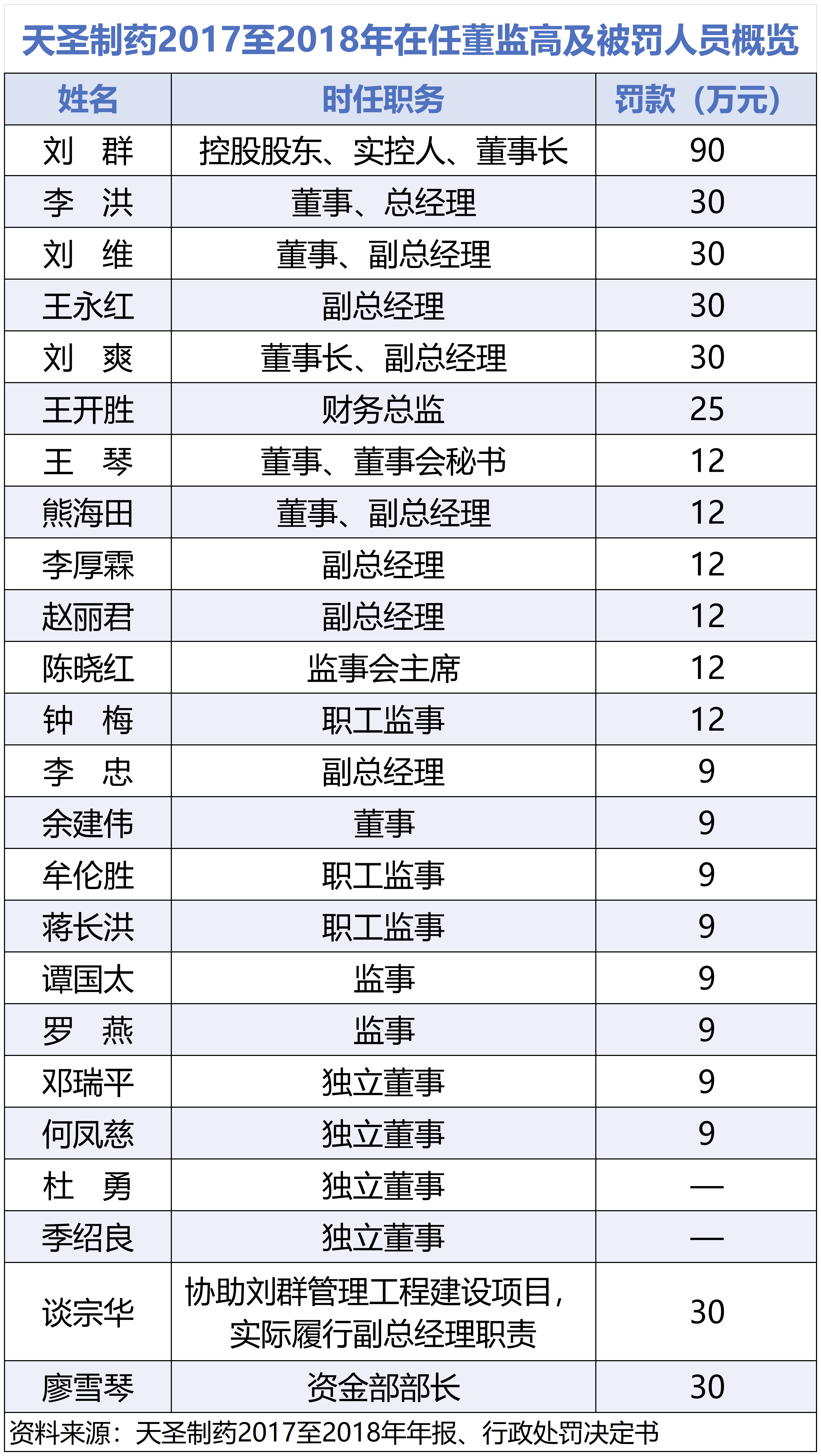 被处罚的22名责任人中,有20人为天圣制药时任董监高,其余2人为直接负责的主管人员(非董监高)。