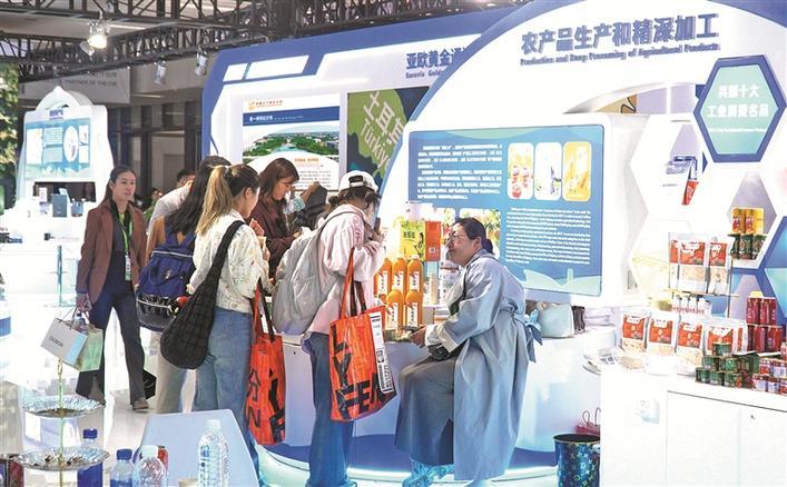 11月6日,在第八届中国国际进口博览会兵团展位,油莎豆、番茄酱、沙棘汁等优质农副产品,成为客商关注的“宝藏好物”。 兵团日报全媒体记者 李柏成 摄