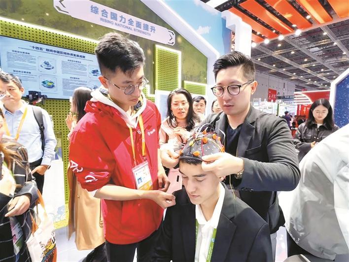 11月6日,在第八届中国国际进口博览会中国馆,一名外国参观者体验非侵入式脑机接口外骨骼机器人的服务。该机器人可应用于脑卒中患者的运动康复训练,通过解码运动意念、驱动外骨骼带动肢体训练,助力神经功能修复。兵团日报全媒体记者 李柏成 摄