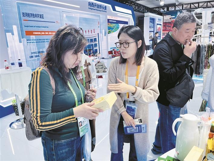 11月8日,在第八届中国国际进口博览会兵团展位,三师图木舒克市一家企业的工作人员(右)向客商介绍公司产品。兵团日报全媒体记者 刘美惠子 摄