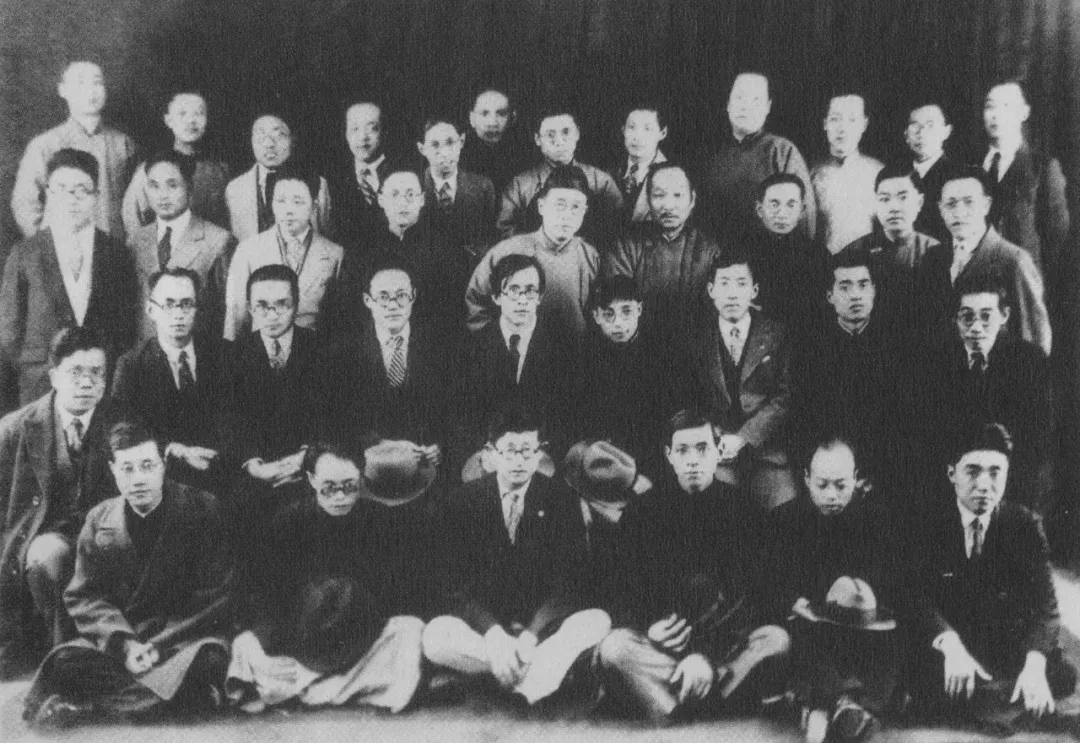 1935年开明书店部分编辑、股东和作者合影。前排左一章锡琛,二排左四开始依次为巴金、王统照、顾均正。三排左五开始依次为舒新城、夏丏尊、林语堂。四排左一开始依次为叶圣陶、徐调孚、钱君匋、胡愈之、茅盾。