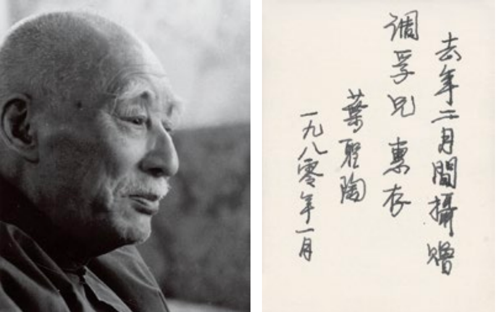 题去年二月间摄。赠调孚兄惠存。叶圣陶,一九八零年一月。