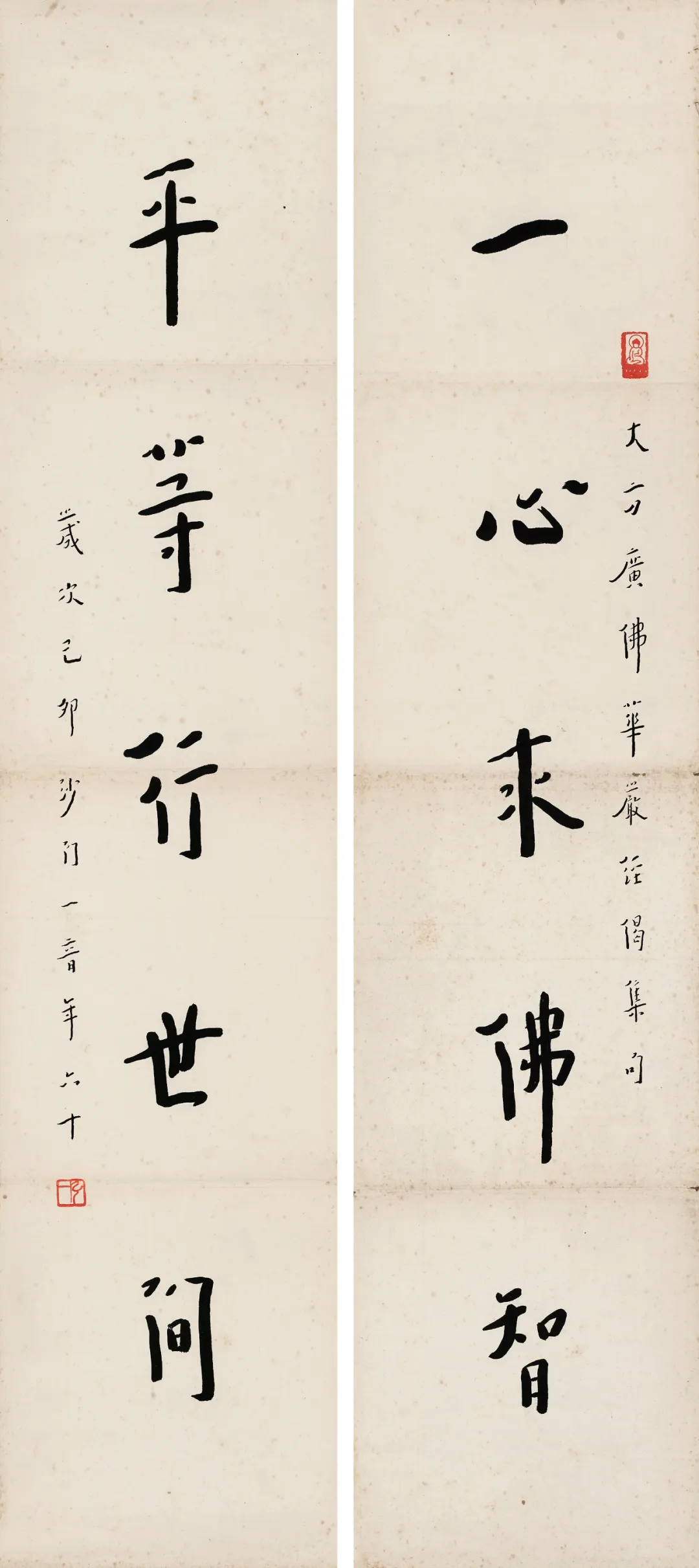 弘一(1880-1942) 行书五言联 镜心 水墨纸本 己卯(1939年)作 80×17.5 cm(每幅) 一心求佛智,平等行世间。
