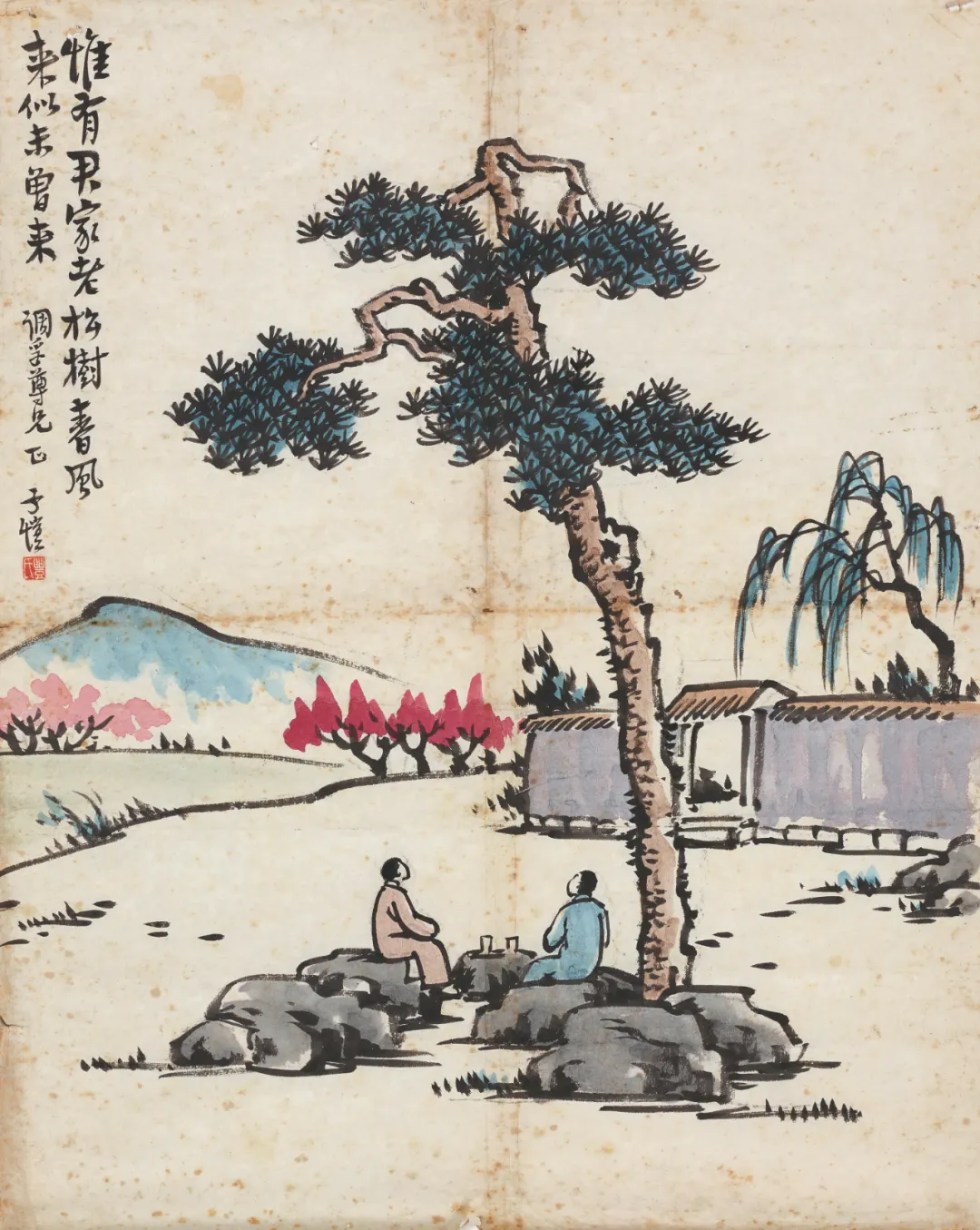 丰子恺(1898-1975) 春风来似未曾来 镜心 设色纸本 43×34.5 cm 镜心 设色纸本 题识 惟有君家老松树,春风来似未曾来。调孚尊兄正。子恺。