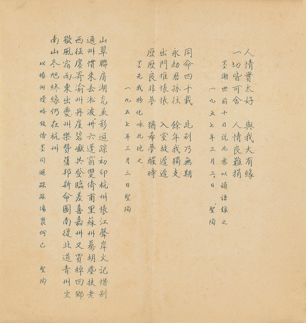 人情实太好,与我大有缘。一切皆可舍,人情良难捐。一九五七年三月三日。圣陶。