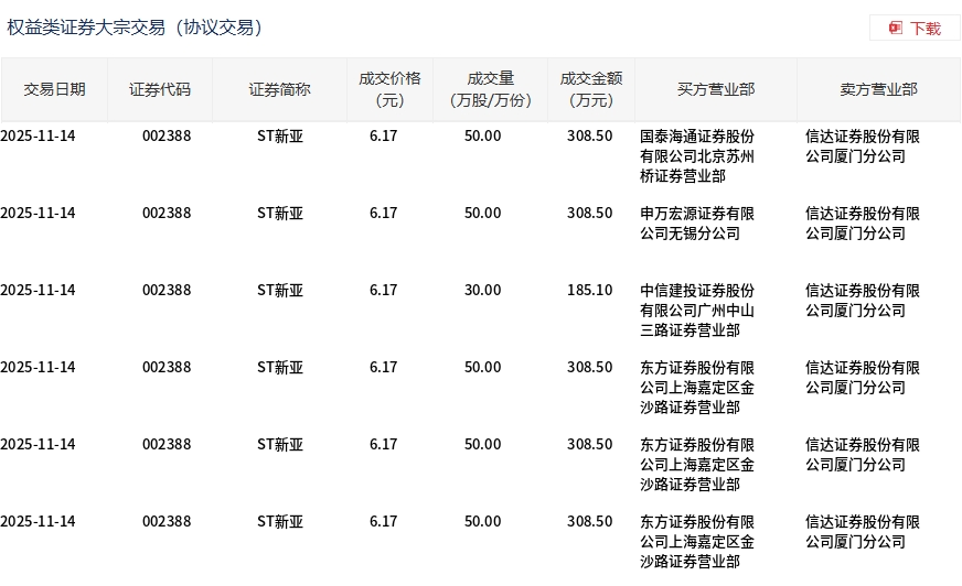 ST新亚今日大宗交易折价成交280万股,成交额1727.6万元