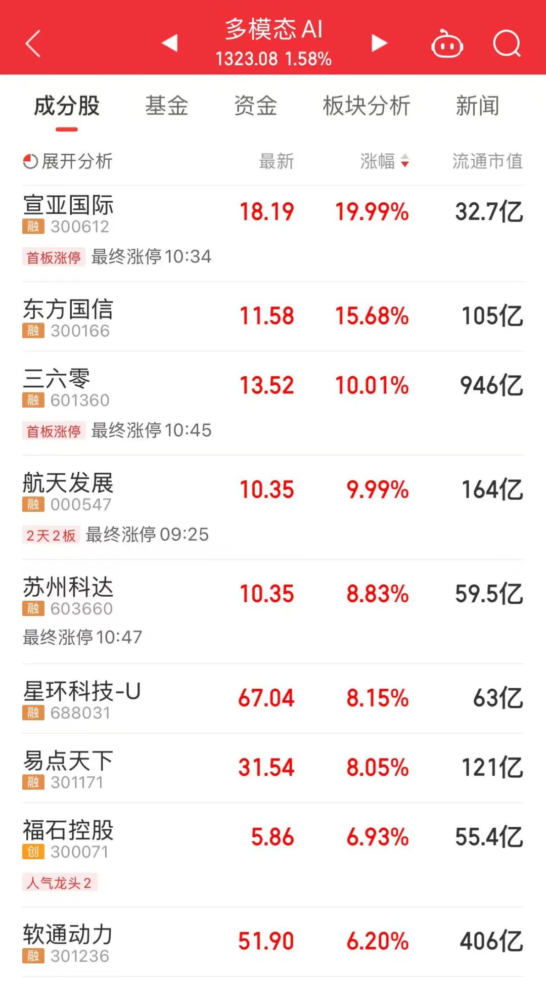 今天上午,科技股迎来反弹,AI应用全面走强,多模态AI、AI智能体等板块上涨。