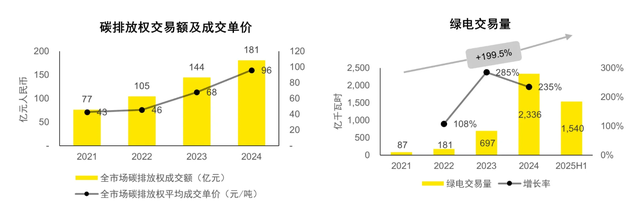 中国碳市场法规逐步完善,交易活跃度提升。全国碳排放权配额(“CEA”)市场在2024年的交易额已达181亿元;2021至2024年,其交易金额及单价复合增长率分别为24%和22%,增长显著。同时,绿电交易爆发式增长,绿电交易量自2021年来复合增长率达200%。综合性碳市场体系及日趋成熟的绿电交易市场,将与能源行业发展新动能相互辉映,服务于“双碳”目标实现。