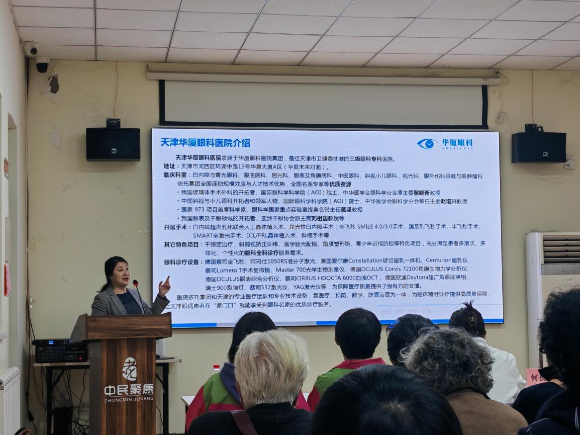 随后天津华厦眼科医院副总经理何长举详细介绍了医院的发展历程与专业优势,并对驿站核心工作内容作出说明。她表示,驿站成立后,我院将定期开展公益检查;安排医护人员上门入户服务,为有需要的行动不便居民提供便利;落地开展为社区退役军人赠送老花镜的暖心活动;同时针对6-12岁儿童开展近视防控科普讲座及筛查,全力守护好社区的“一老一小”视觉健康。