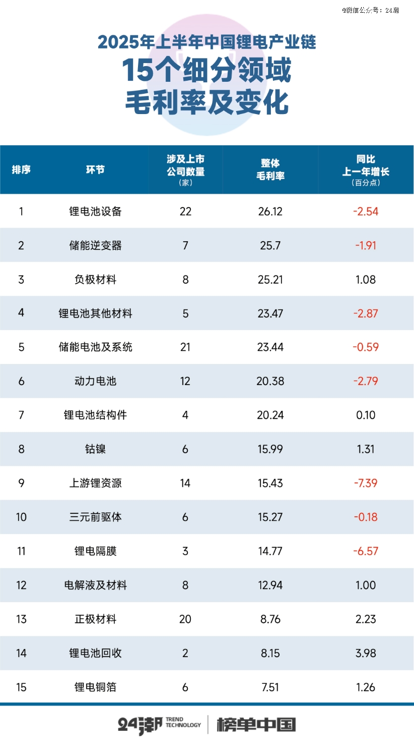 从多个数据看,正极材料江湖确实到了非常危险的境地。比如据24潮产业研究院(TTIR)此前统计:2025年上半年,20家上市公司 “正极材料” 业务整体毛利率仅为8.76%,在整个锂电产业领域(15个细分领域)中位列第13位,而下游动力电池企业毛利率是20.38%,盈利能力是前者的2.33倍。
