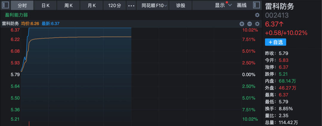 此外,低空经济板块也表现活跃。雷科防务开盘仅约8分钟直线涨停;特发信息(维权)同样快速涨停,连续第2日封板;飞沃科技、广汽集团等逾10股涨停或涨超10%。