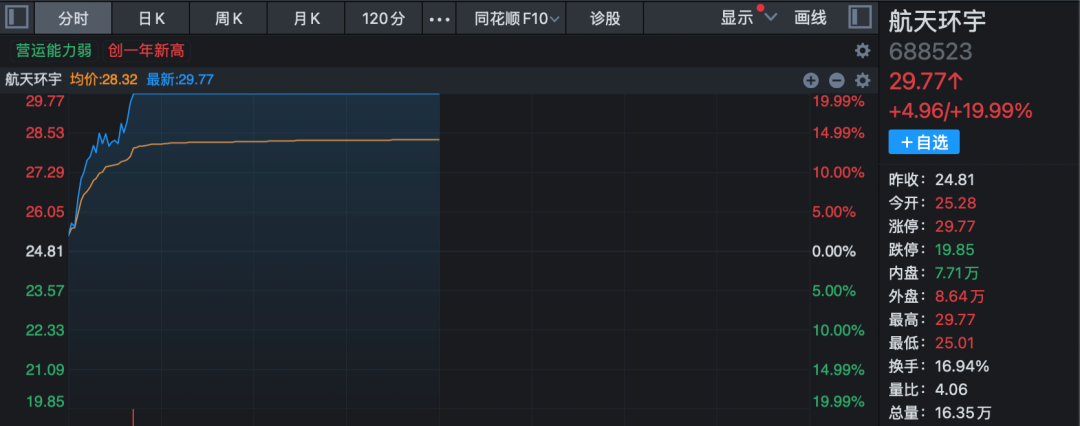 国防军工股早间全线上攻,板块指数放量高开高走。航天环宇高开后快速20%涨停,股价创2年来新高(复权,下同),开盘不到10分钟成交超前一交易日全天成交;久之洋、雷科防务、天箭科技等涨停或涨超10%。