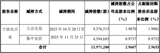 2025年10月28日至2025年11月25日,宁波众点易减持股数为13,971,200股,减持股数占公司总股本比例2.9607%,占剔除回购股份后总股本比例2.9653%。