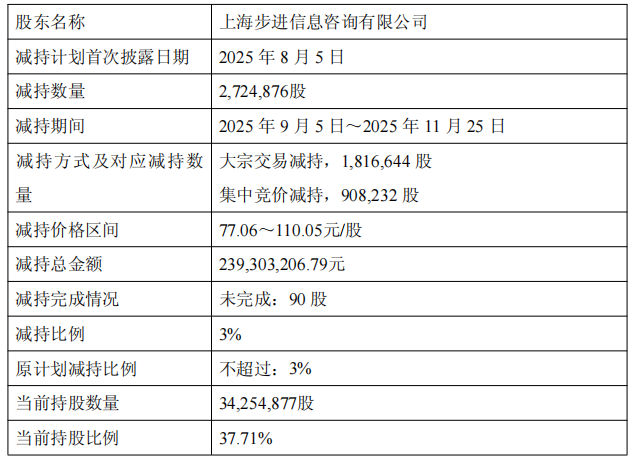 2025年9月5日至2025年11月25日,上海步进通过大宗交易方式累计减持公司股份1,816,644股,通过集合竞价方式累计减持公司股份849,432股,减持价格区间为77.06至110.05元/股,减持总金额为239,303,206.79元。