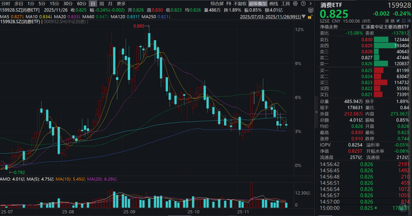 今日(11.26),大消费表现震荡,消费ETF(159928)小幅收跌0.24%,全天成交额超4亿元!资金面上,消费ETF(159928)近20日净流入超3.8亿元!截至11月25日,消费ETF(159928)最新规模超212亿元,同类断层领先!热门成分股中,新诺威涨超4%,泸州老窖涨1%,贵州茅台、伊利股份微涨。