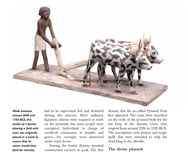 埃及出土的公元前2040年至公元前1750年间的陶器殉葬品,表现出在金属农具出现之前,古代人用两牛挽木犁耕地的生动场景。来源:Ancient Egypt: An Illustrated History, by Brother Elias, Marshall Cavendish, 2022, p.10。 美国中东史学家肯尼斯•哈尔(Kenneth W. Harl)认为,埃及尼罗河地区的农业和以城市文明出现的时间,当比苏美尔稍晚。理由是直到公元前5000年左右,尼罗河才形成现在的河道,农业才有可能。公元前5000年左右,埃及人通过西奈人和腓尼基人,将苏美尔人驯养的山羊、牛、小麦和大麦引入了尼罗河谷。由于尼罗河水文可以预测,每年基本上准时发洪水,准时退去。沿河岸土壤肥沃,更适合种植。此后埃及迅速出现了新石器时代风格的村庄。来源: Origins of Great Ancient Civilizations, by Professor Kenneth W. Harl, Tulane University, The Great Courses, 2020, p.6